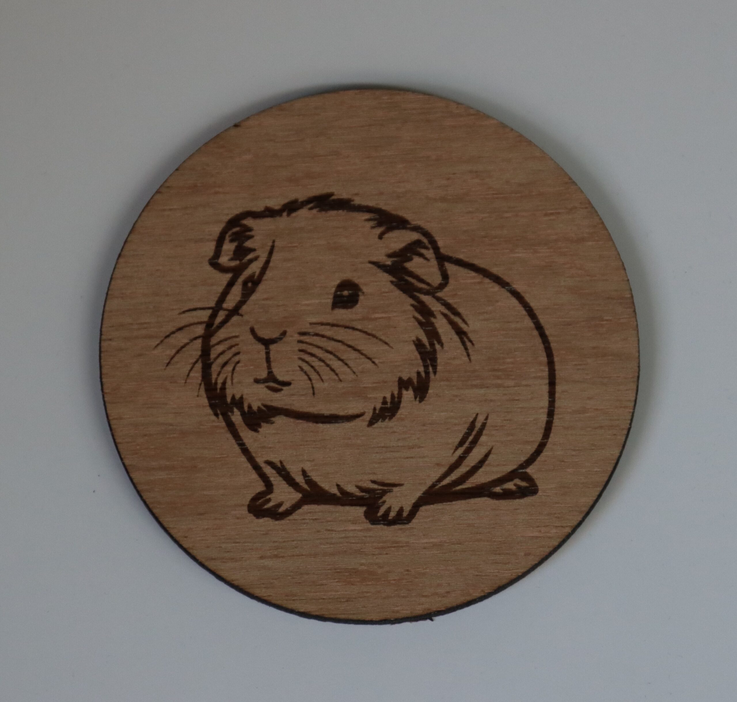 Unieke handgemaakte onderzetter met afbeelding van een Cavia. Model 7. Behandeld met lak en licht waterbestendig.